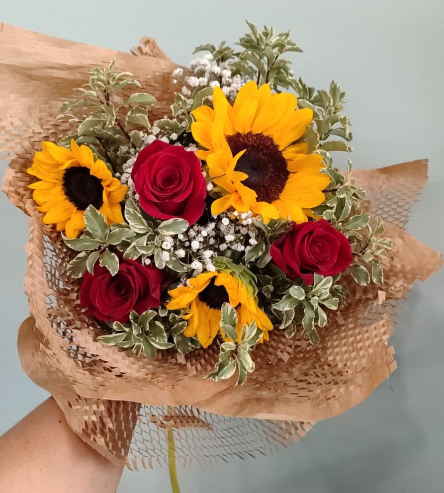 Concediti un'esplosione di felicità con il nostro Bouquet Raggio di Sole e Rose. Ravviva qualsiasi occasione con questo allegro mix di rose rosse e girasoli. Perfetto per diffondere gioia e sorrisi!